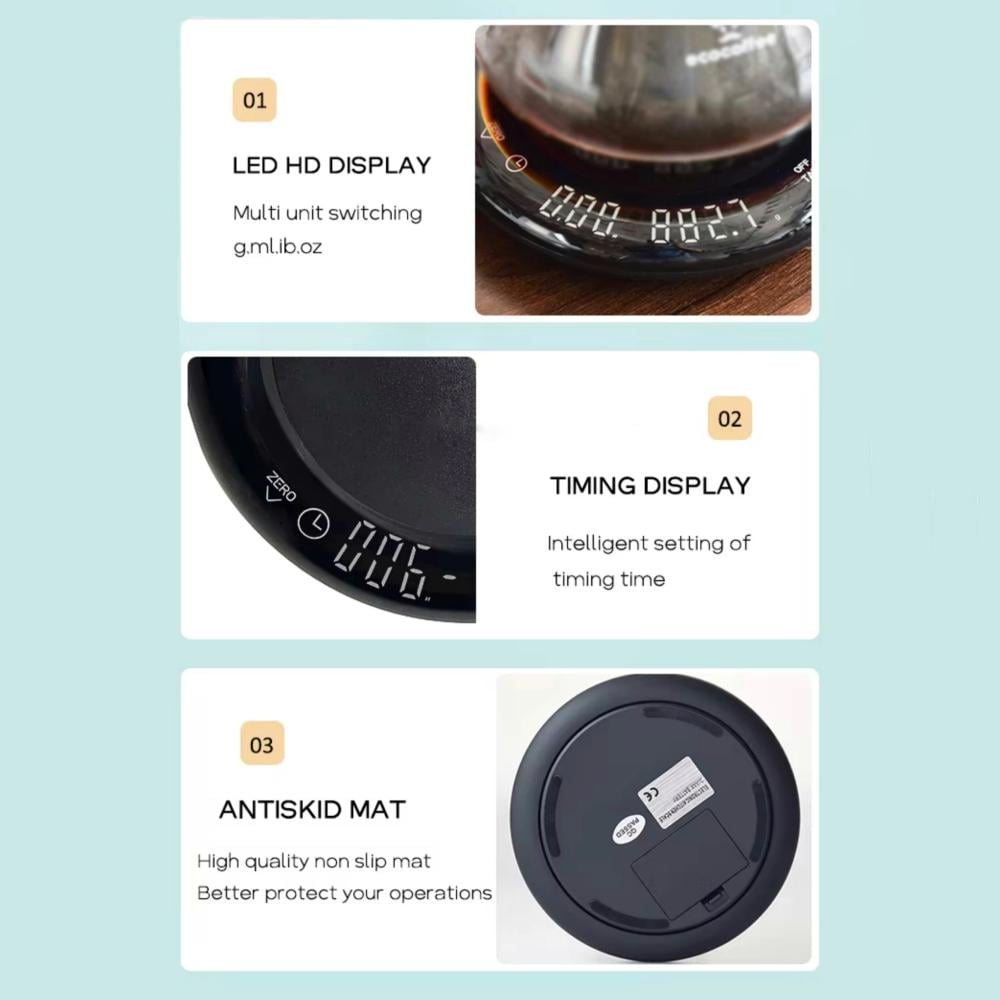 ارتقِ بتجربة تحضير القهوة المختصة مع هذا الميزان الإلكتروني الذكي، المصمم خصيصًا لعشاق الدقة والاحتراف في التقطير. بفضل شاشته الـ LED اللمسية وحساساته عالية الدقة، ستحصل على نتائج متسقة في كل مرة.
