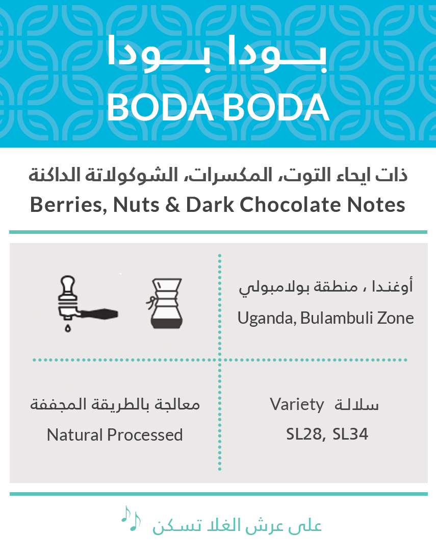 ذات إيحاء التوت ، المكسرات ، الشوكولاتة الداكنة يأتي المحصول المميز بودا بودا من منطقة بولامبولي في اوغندا ومعالجته بالطريقة المجففة ..حبوب البُن كاملة