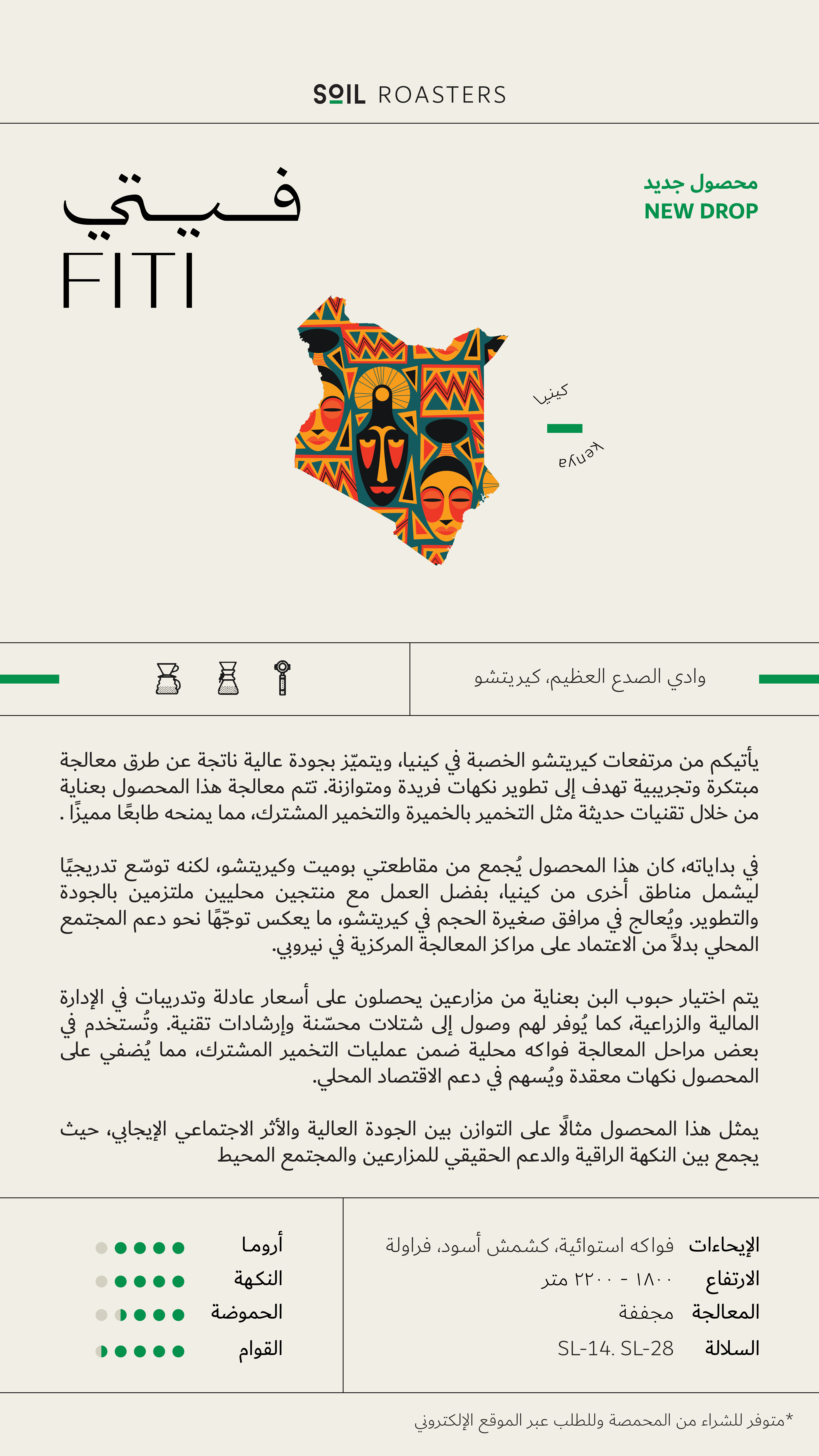 يأتيكم هذا المحصول من مرتفعات كيريتشو الخصبة في كينيا، ويتميّز بجودة عالية ناتجة عن طرق معالجة مبتكرة وتجريبية تهدف إلى تطوير نكهات فريدة ومتوازنة. تتم معالجة هذا المحصول بعناية من خلال تقنيات حديثة مثل التخمير بالخميرة والتخمير المشترك، مما يمنحه طابعًا مميزًا .