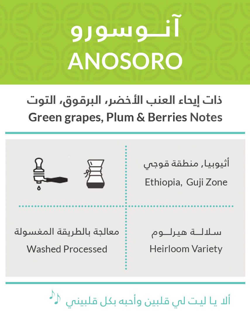 حلوة، ، ذات إيحاء العنب الأخضر، البرقوق، التوت يأتي المحصول المميز انوسورو من منطقة قوجي في أثيوبيا ومعالجته بالطريقة المغسولةحبوب البُن كاملة