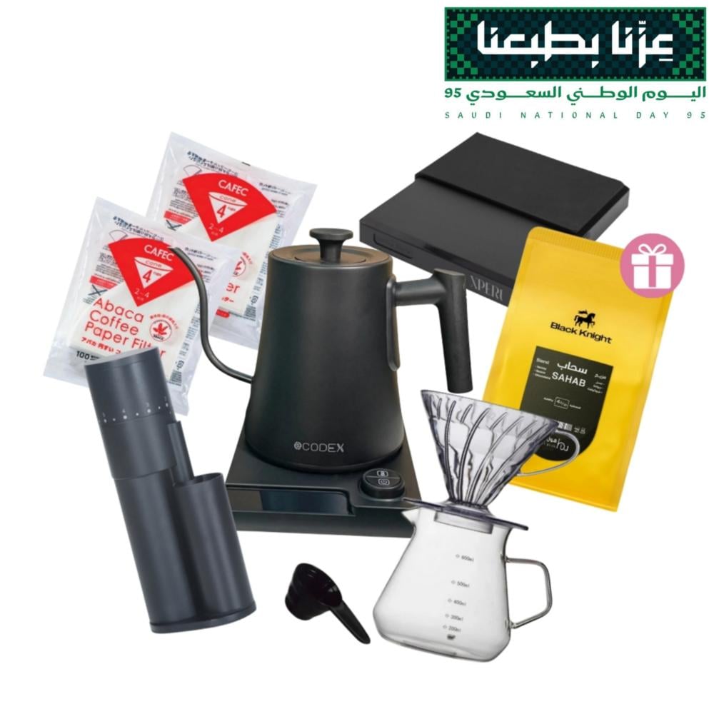 تتضمن حامل V60، إبريق تقديم، وملعقة قياس. تصميم عملي وأنيق، يضمن استخلاصًا متوازنًا ونكهة نقية في كل كوب.