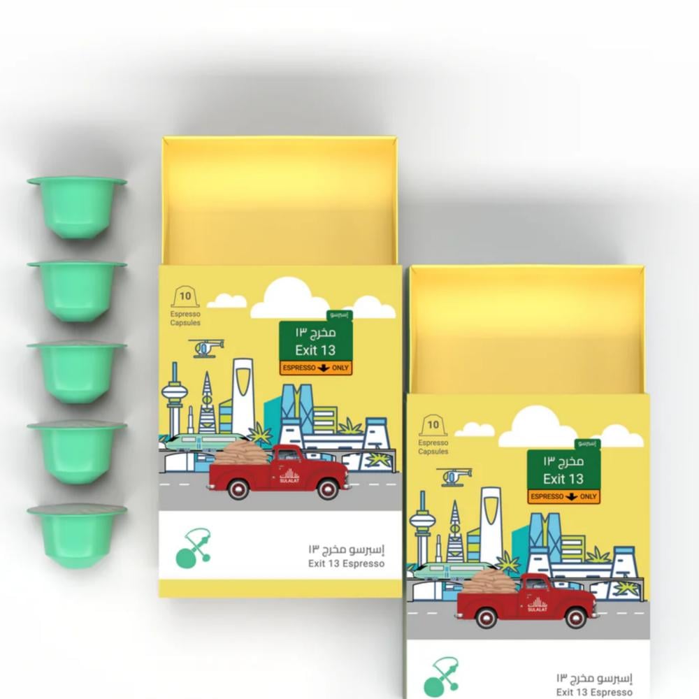 كبسولات مخرج 13 تأتي بنفس الخلطة الأصلية المستعملة في خلطة "مخرج 13" المكونة من محاصيل من الجافا وقواتيمالا وإثيوبيا. تتميز هذه الخلطة بحلاوة عسلية واضحة وقوام كريمي ثقيل كالدبس ونكهة الفاكهة المجففة وعبق الكاكاو الفاخر ممزوج بالحطب والعود. وتتناسب مع مكائن كبسولات القهوة مورنينق و نيسبريسو